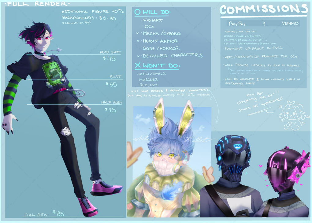 - After the sketch is finalized, rendering will be started with the piece and the requester will be updated about the progression of the commission.